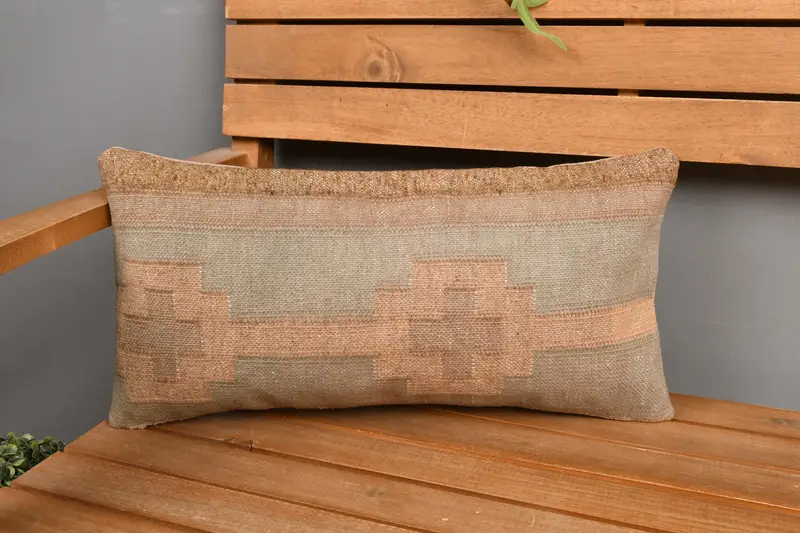 Braunes und grünes geometrisches Kissen, handgefertigtes Leinenkissen