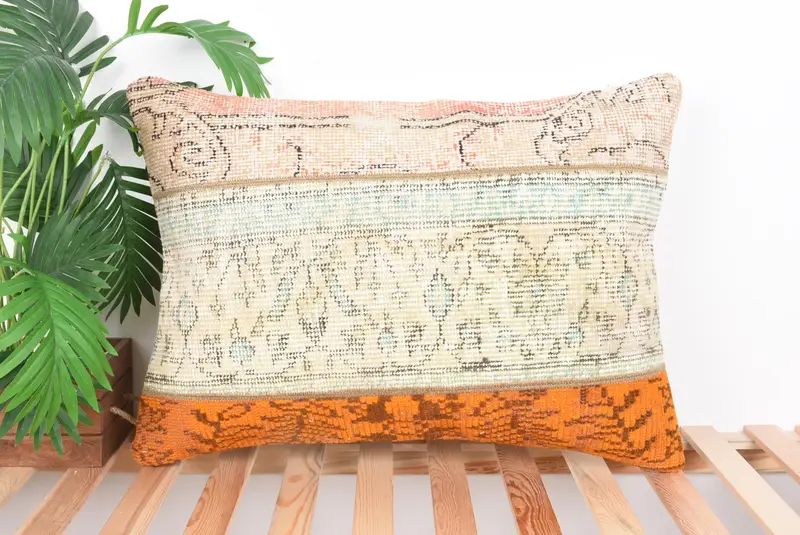 Besticktes Patchwork-Wurfkissen in Beige und Orange, handgefertigtes rechteckiges Kissen