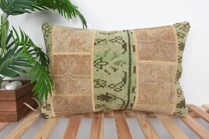 Grünes und braunes Patchwork-Wurfkissen, handgemachtes Vintage-Rechteckkissen