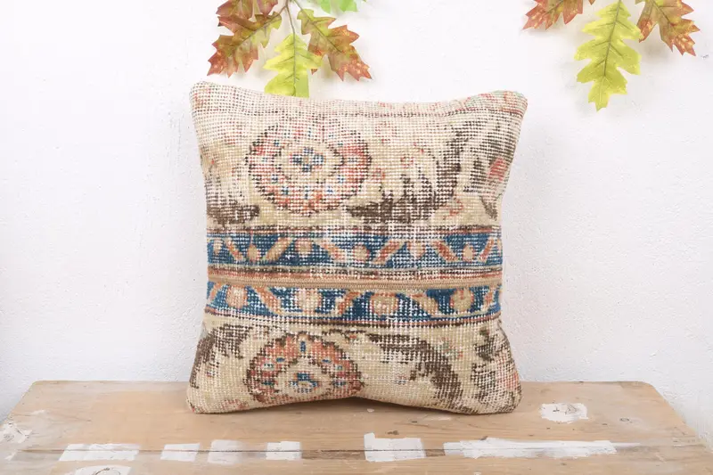 Blaues und beiges Patchwork-Wurfkissen, 16x16 besticktes Vintage-Kissen