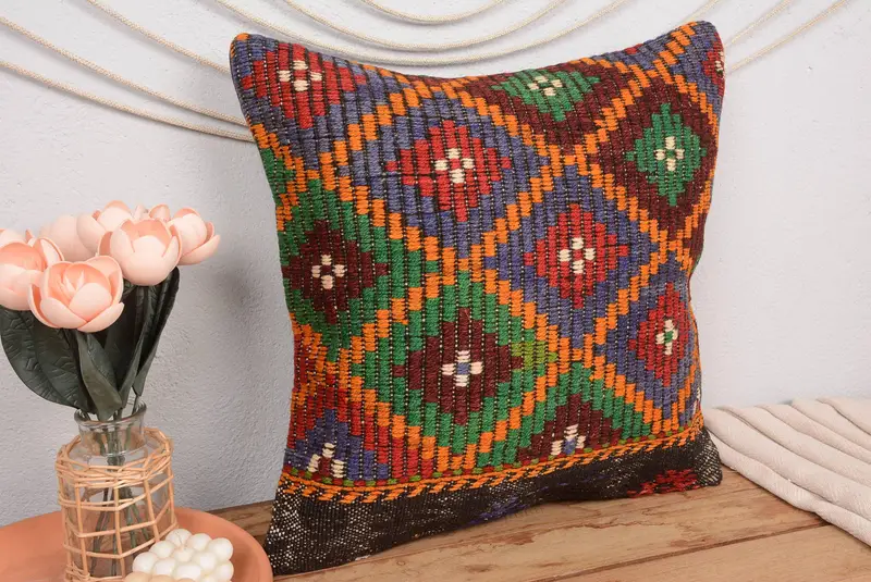 Handgefertigtes grün & orange gestreiftes Kissen, Vintage besticktes Kissen