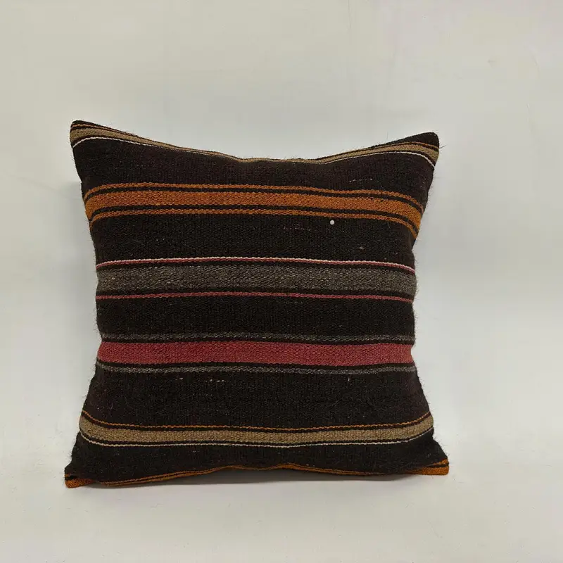 Braun und rosa gestreiftes Kissen, besticktes Vintage-Leinenkissen