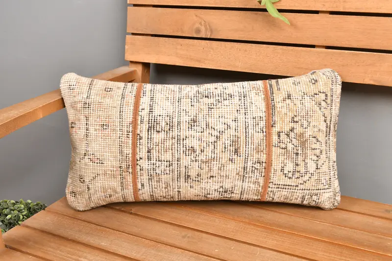 Besticktes Patchwork-Kissen in Beige und Braun, handgefertigtes Wurfkissen