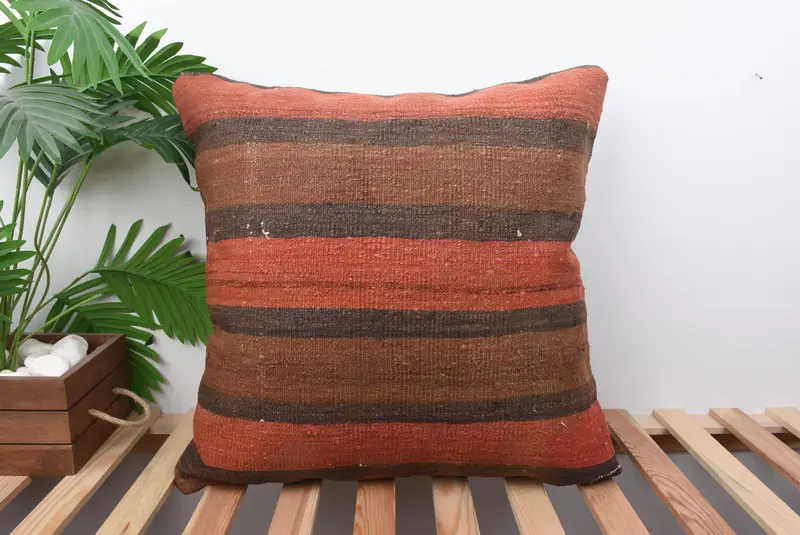 Orange & braun gestreiftes Kissen, Vintage besticktes Kissen