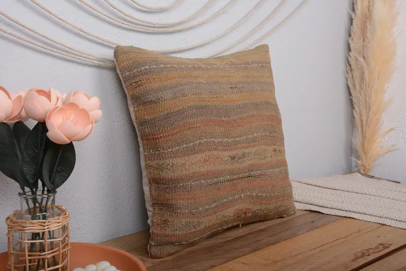 Beige & braun gestreiftes Kissen, handgefertigtes besticktes Kissen