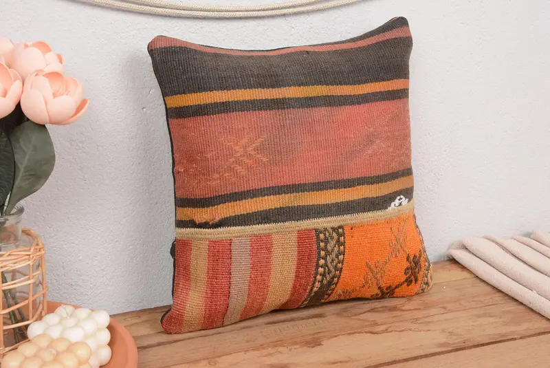 Rot & Braun besticktes Patchwork Kissen, handgemachtes Vintage Kissen