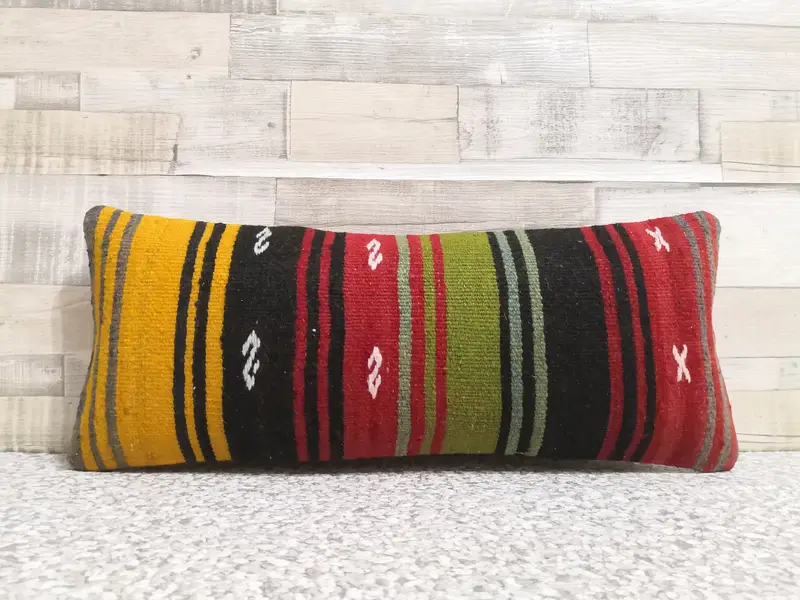 Handgefertigtes gestreiftes Wollkissen, Vintage-Rechteckkissen in Rot und Grün