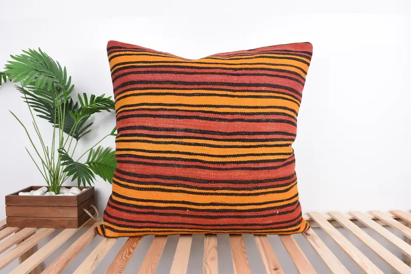 Rot & Orange gestreiftes Kissen, handgemachtes besticktes Leinenkissen