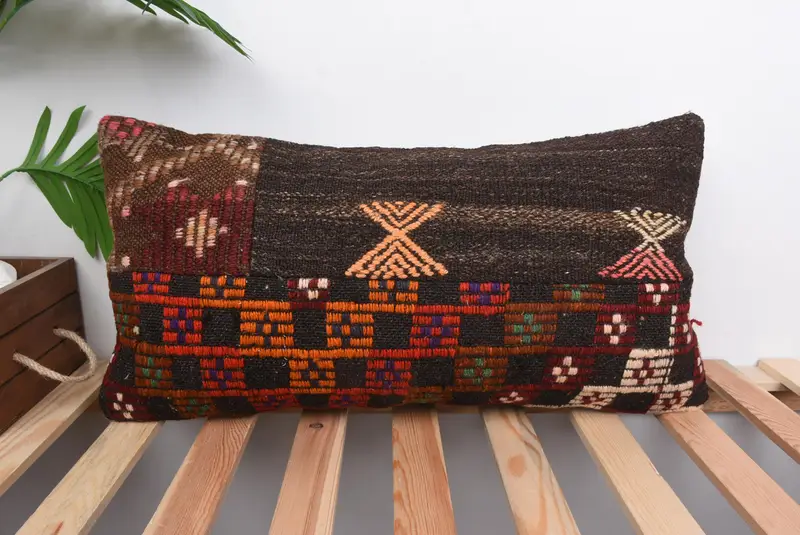Besticktes Patchwork-Kissen in Orange und Braun, handgefertigtes rechteckiges Wurfkissen