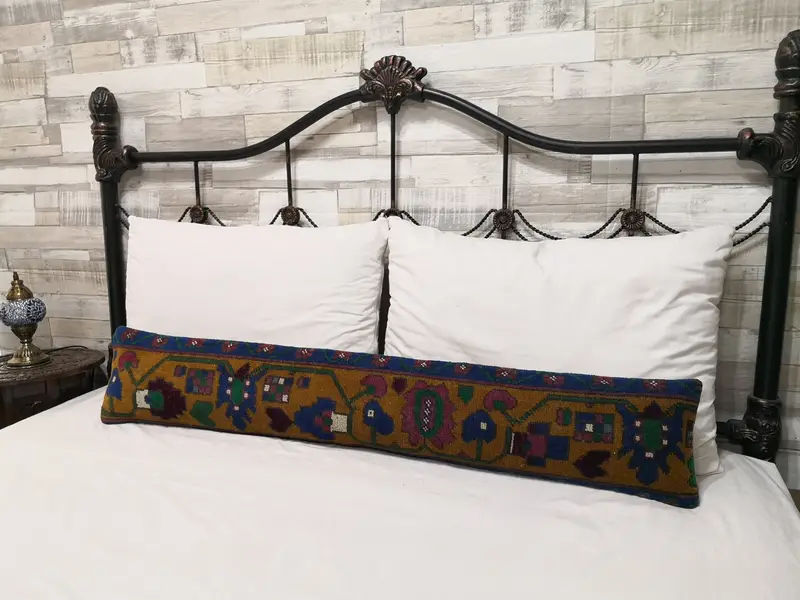 Handgefertigtes blaues und braunes Blumen-Wurfkissen, Vintage-Rechteckkissen
