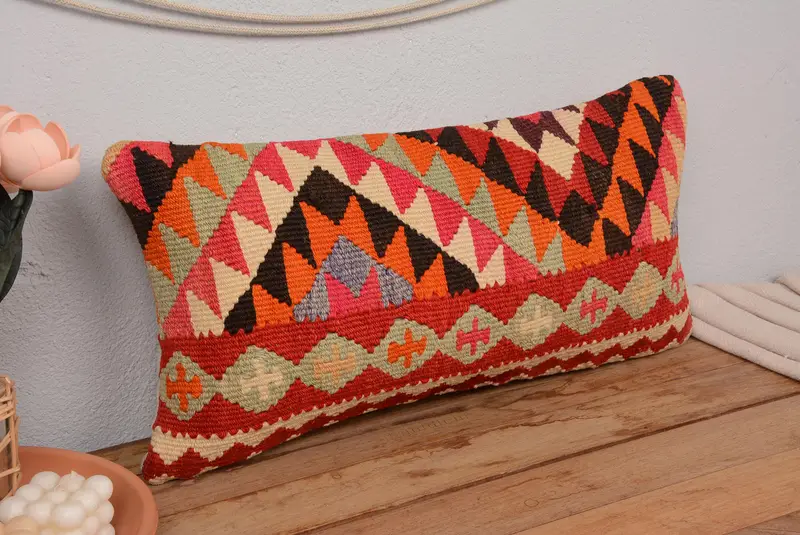 Handgefertigtes besticktes Kissen, 12x24 rosa & orange geometrisches Wurfkissen