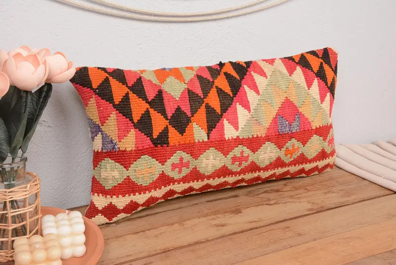Gesticktes geometrisches Kissen in Braun und Orange, handgefertigtes Vintage-Kissen