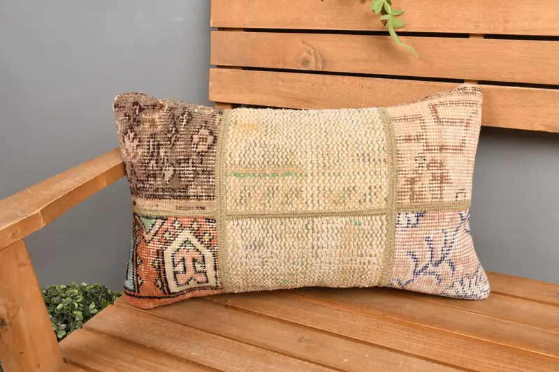 Beige & rotes Patchwork-Wurfkissen, handgemachtes rechteckiges Kissen