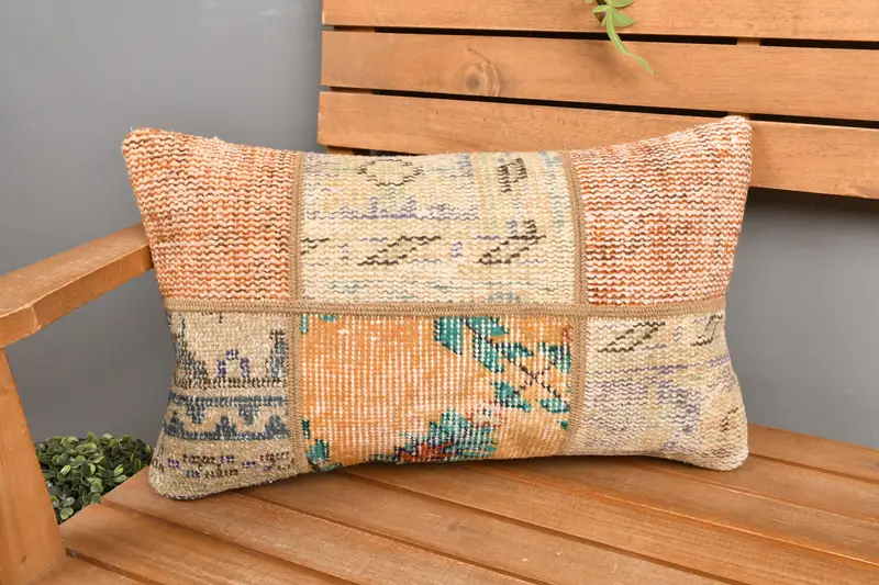 Orange & Beige Patchwork Kissen, handgemachtes besticktes Kissen