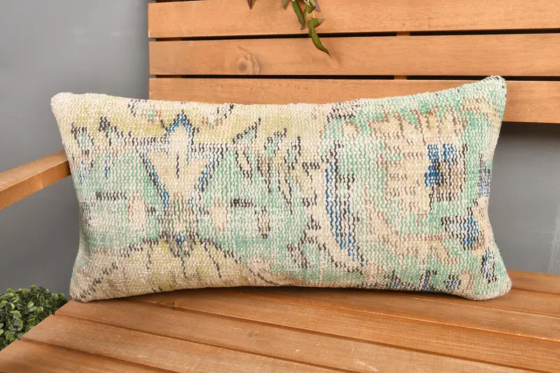 Handgefertigtes 12x24 grünes Leinenkissen, Vintage Blumenkissen