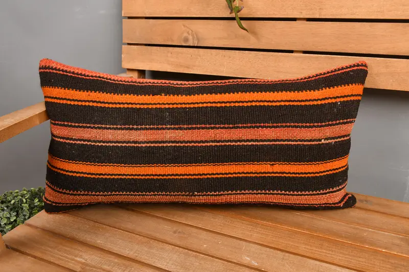 Braun & Orange gestreiftes Kissen, 12x24 besticktes Leinenkissen