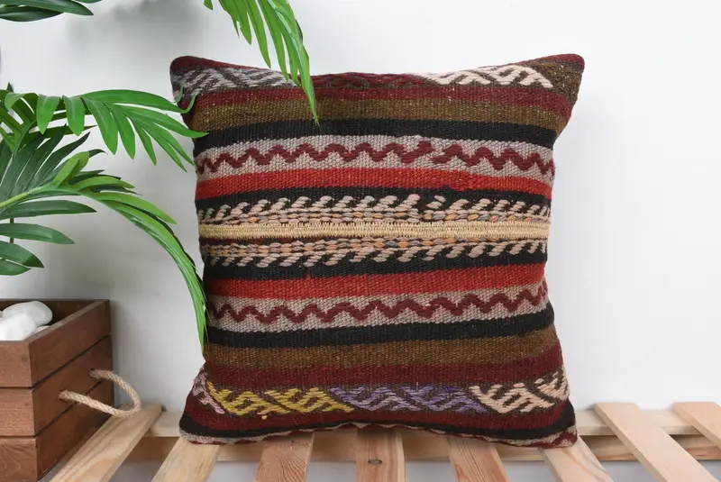 Braunes und rotes Patchwork-Wurfkissen, 16x16 besticktes Kissen