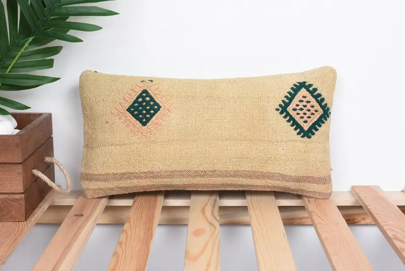 Beigefarbenes südwestliches Kelim-Wurfkissen, 8x16 besticktes Vintage-Kissen