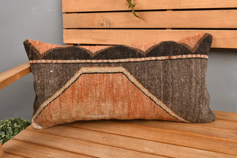 Handgefertigtes besticktes Kissen, braunes und rotes geometrisches Leinenkissen