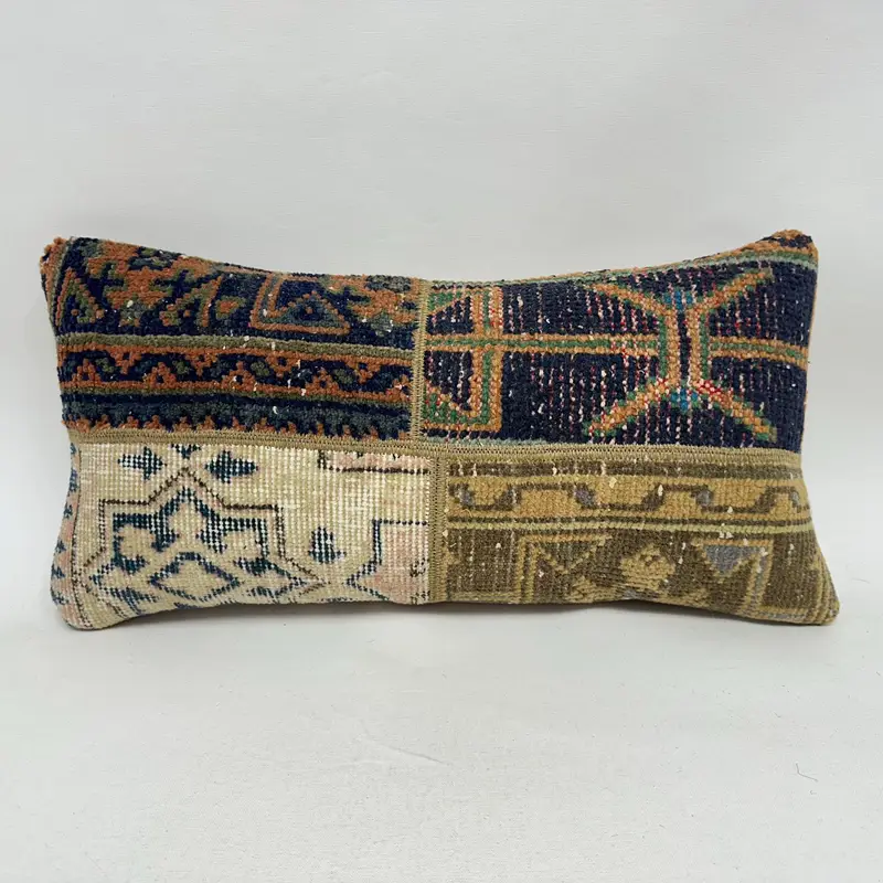 Blaues und beiges Patchwork-Kissen, handgefertigtes besticktes Kissen