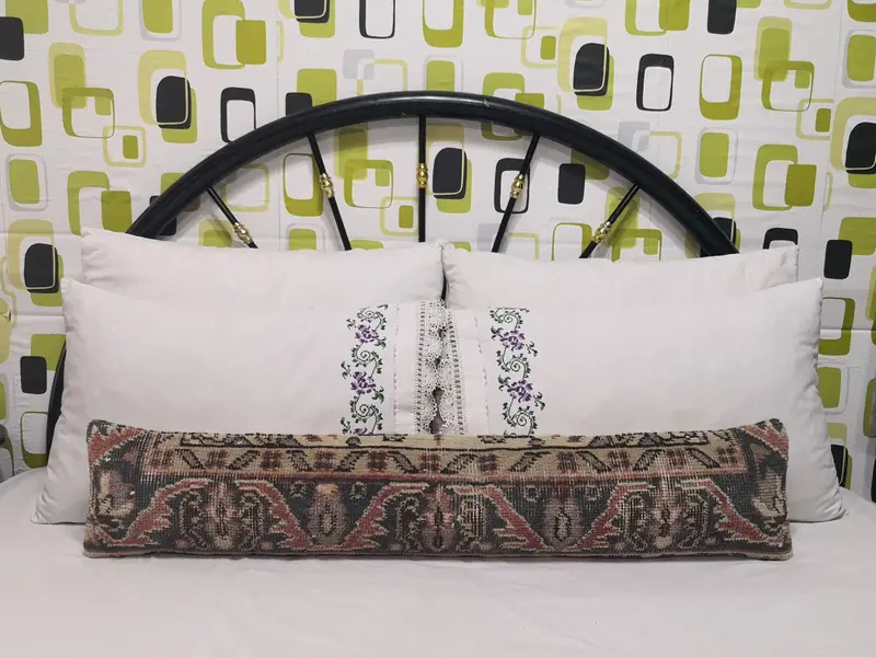 Handgefertigtes besticktes Wollkissen, Vintage-Wurfkissen mit geometrischem Design