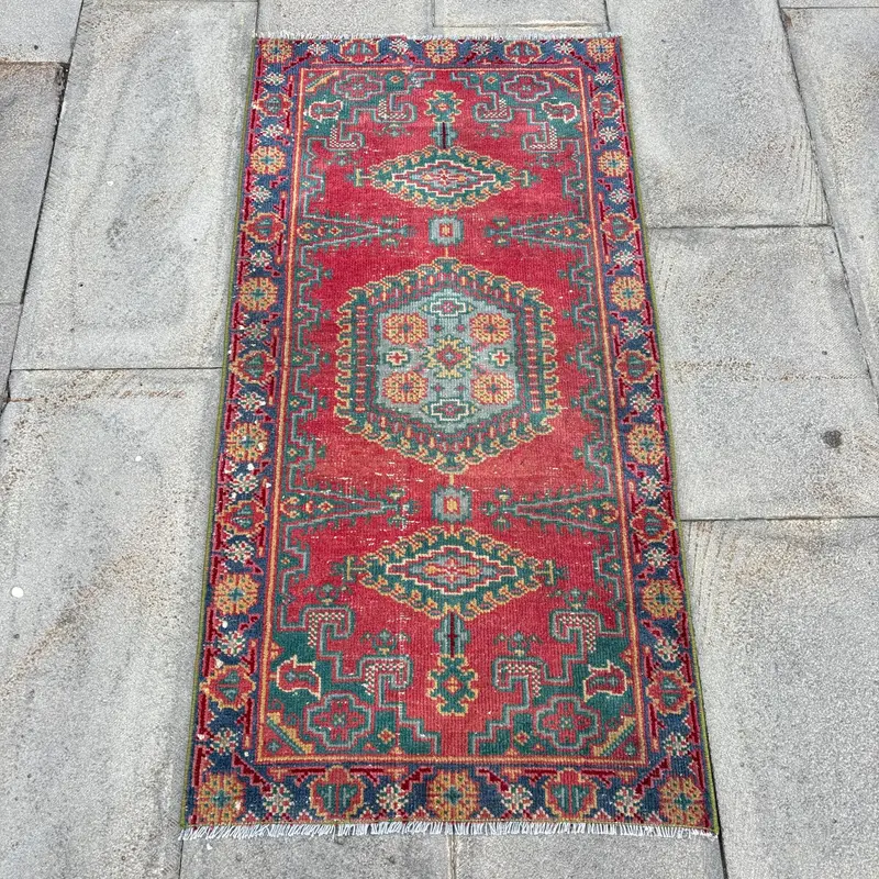Roter abstrakter Teppich, 2 x 4 Fuß, lebendige grüne Akzente