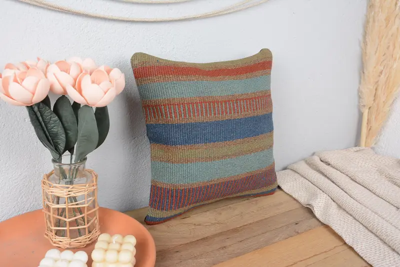 Blau & Grün gestreiftes Kissen, 14x14 besticktes Vintage Kissen