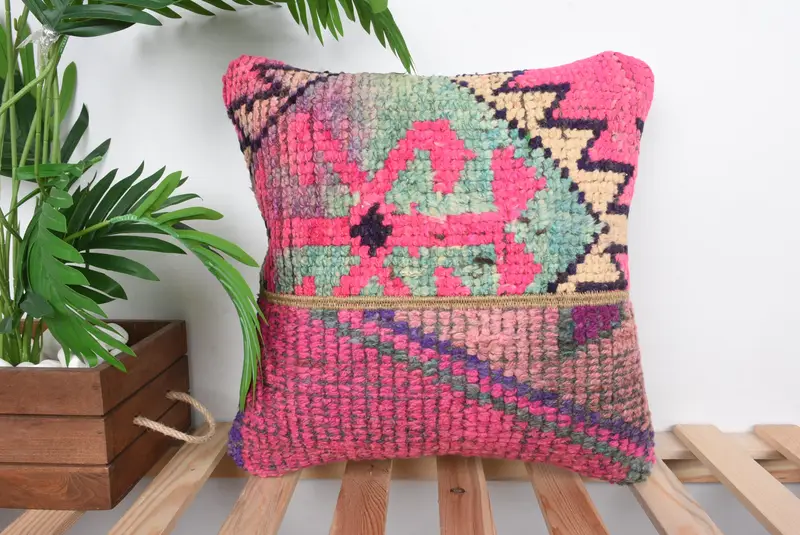 Besticktes Patchwork-Wurfkissen in Rosa und Grün, handgefertigtes Vintage-Kissen