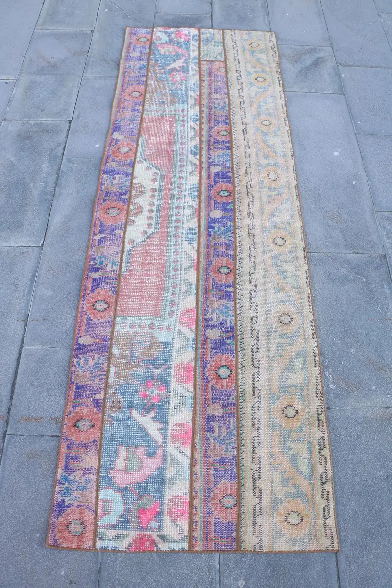 Roter und blauer Orientteppich, 2,5 x 7,6 Fuß, elegantes Dekor