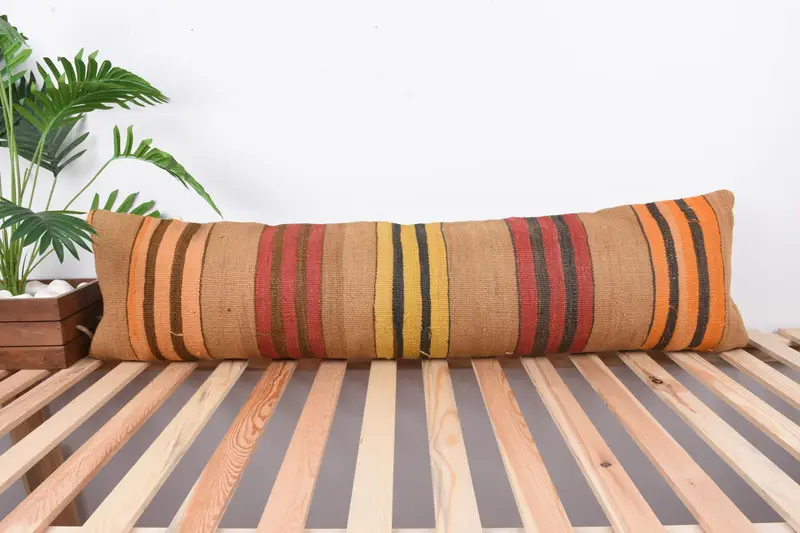 Besticktes orange & rot gestreiftes Wurfkissen, handgemachtes Leinenkissen