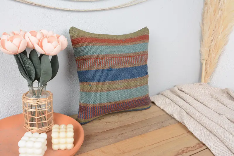 Handgefertigtes grün & bronze gestreiftes Kissen, Vintage besticktes Leinenkissen