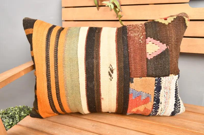 Beige & braunes Patchwork-Wurfkissen, handgefertigtes besticktes Kissen