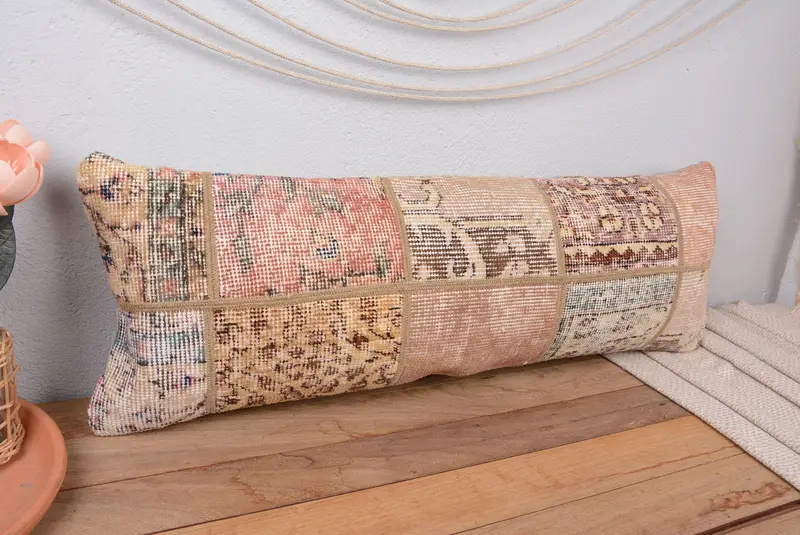 Besticktes Patchwork-Kissen in Beige und Braun, 12x36 handgemachtes Wurfkissen