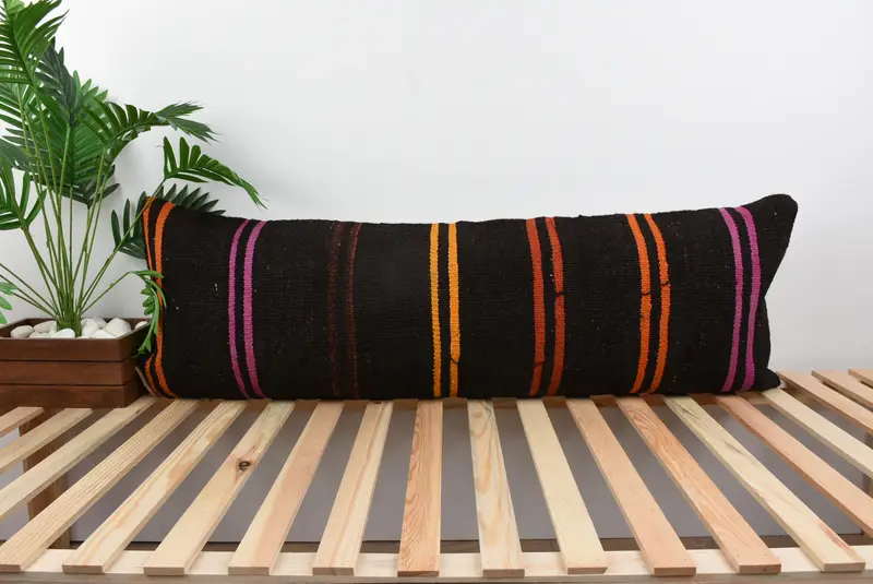 Gesticktes braunes und regenbogengestreiftes Wurfkissen, handgefertigtes Leinenkissen