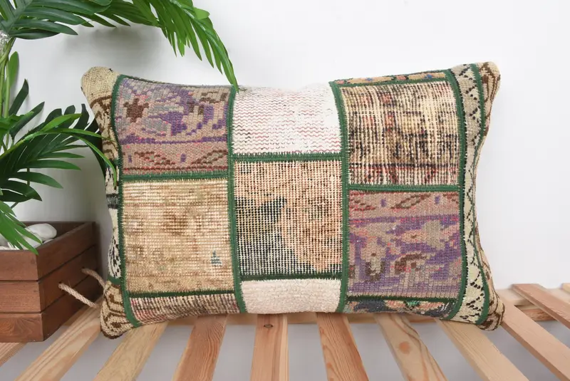 Braunes und lila Patchwork-Wurfkissen, handgefertigtes besticktes Kissen