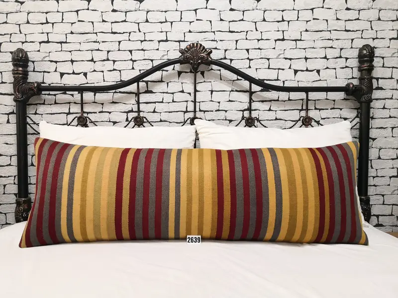 Handgefertigtes gestreiftes Wollkissen, Vintage-Kissen in Rot und Bronze
