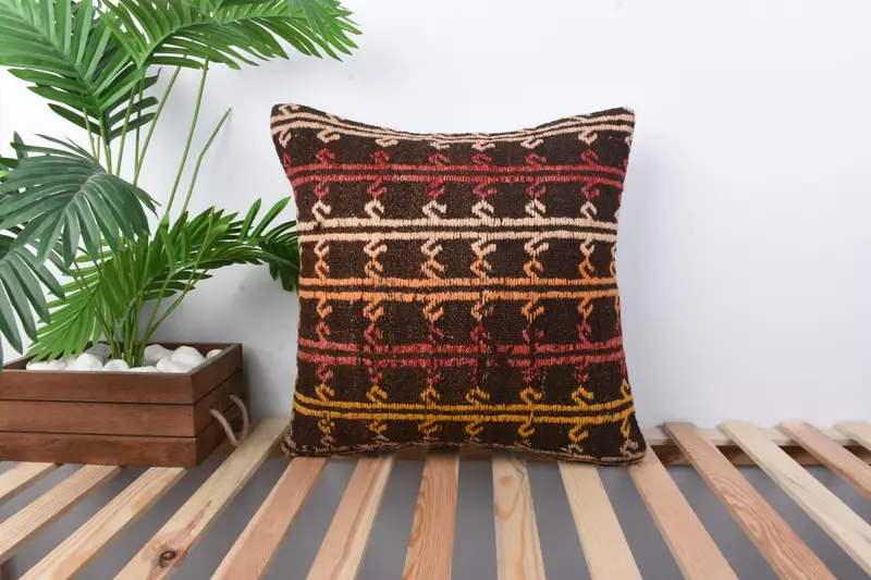 Gesticktes braun & orange gestreiftes Kissen, 20x20 handgemachtes Wurfkissen