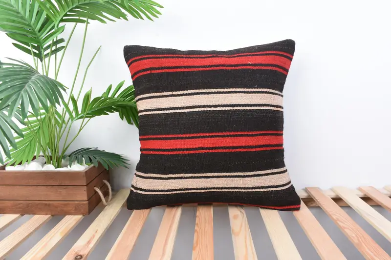 Gesticktes braun-rot gestreiftes Kissen, handgemachtes 20x20 Wurfkissen