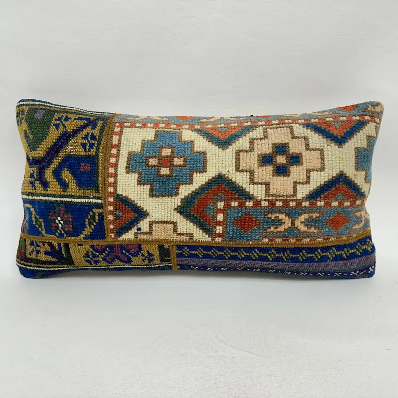 Blaues und beiges Patchwork-Wurfkissen, handgefertigtes besticktes Kissen