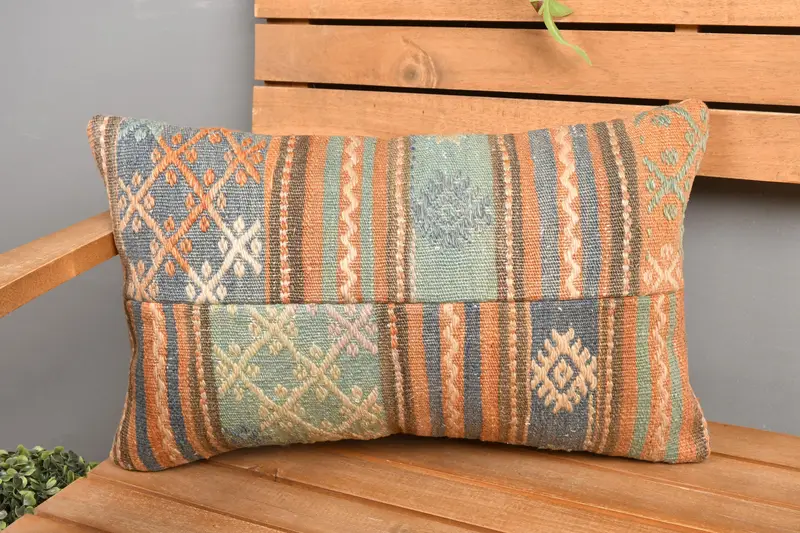 Grün & Orange Patchwork Kissen, 12x20 handgemachtes Leinenkissen