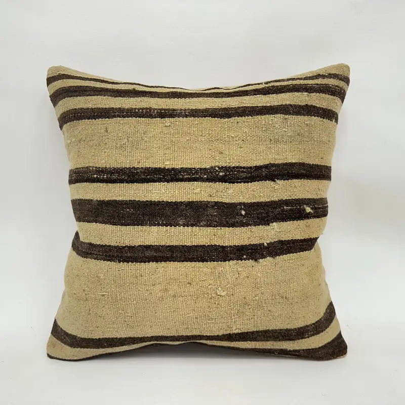 Besticktes Beige & Braun gestreiftes Wurfkissen, handgemachtes Vintage Kissen