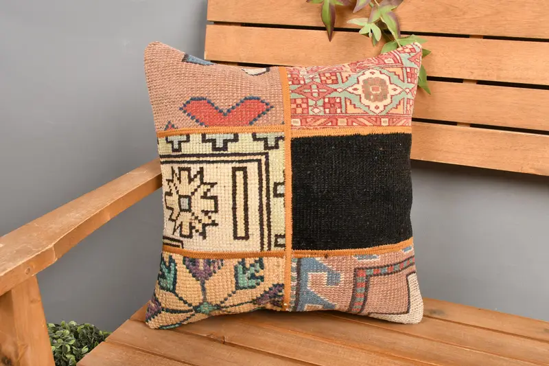 Beige & grünes Patchwork-Wurfkissen, 16x16 besticktes Kissen