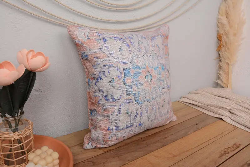 Handgefertigtes besticktes Kissen, blaues florales Leinenkissen