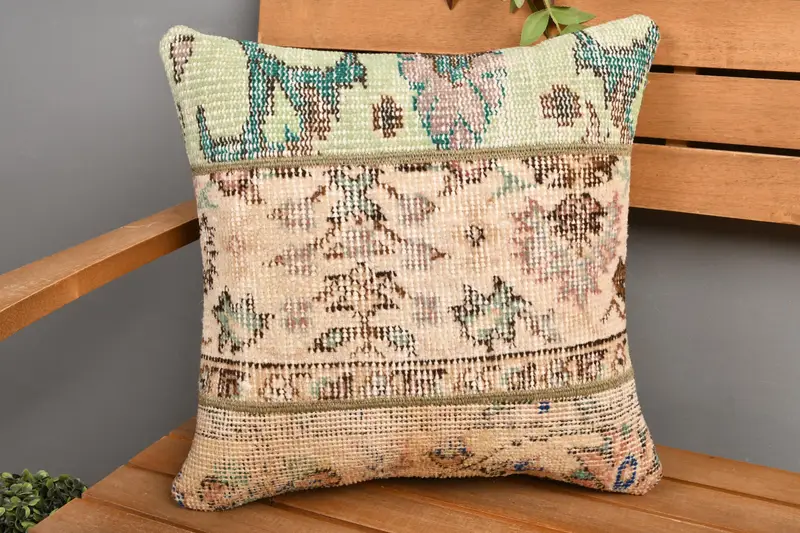 Beige-grünes Patchwork-Wurfkissen, 16x16 besticktes Kissen