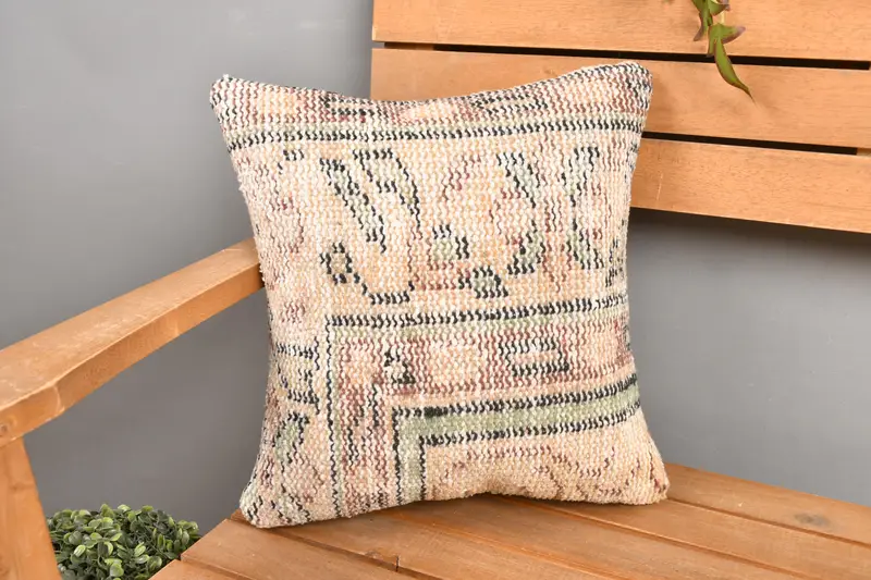 Gesticktes Vintage-Wurfkissen, beige und grünes Blumenkissen