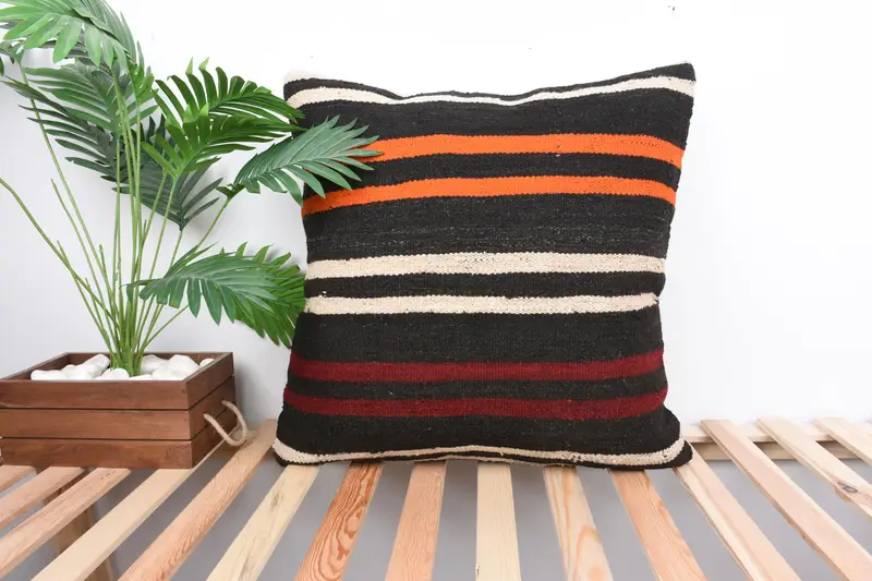 Braun-weiß gestreiftes Wurfkissen, besticktes Leinenkissen