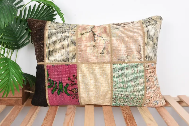 Beige & grünes Patchwork-Wurfkissen, 20x28 handgemachtes Kissen