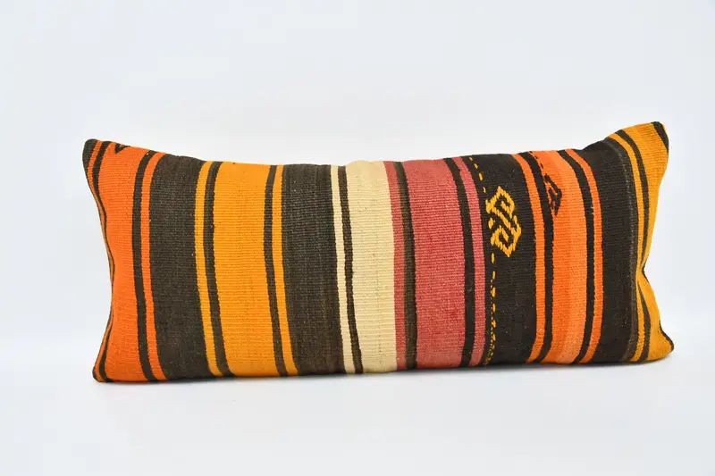 Handgefertigtes gestreiftes Wurfkissen, 16x36 orangefarbenes Kissen mit Hanfbezug