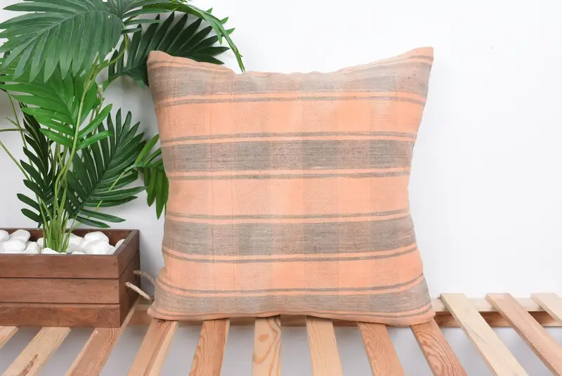 Orange & grau gestreiftes Kissen, handgefertigtes besticktes Kissen