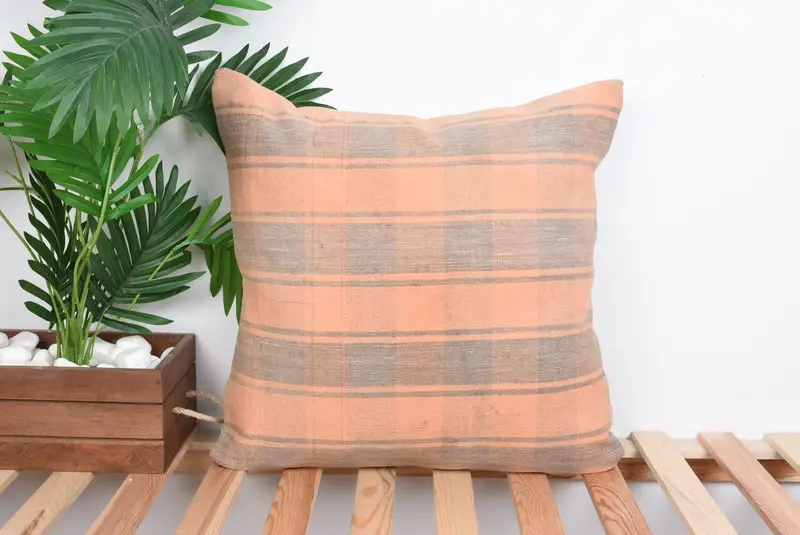 Orange und grau gestreiftes Wurfkissen, besticktes Vintage-Kissen